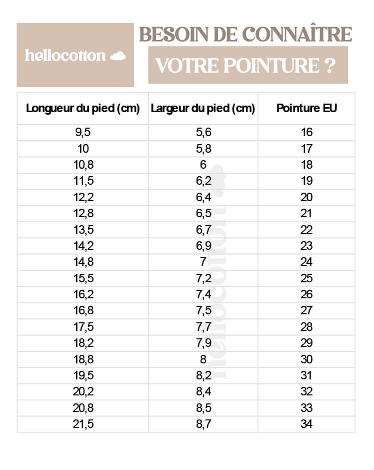 Chez HELLOCOTTON, nous savons que bien choisir la taille des chaussons est essentiel pour accompagner les premiers pas de bébé. Voici quelques repères :
