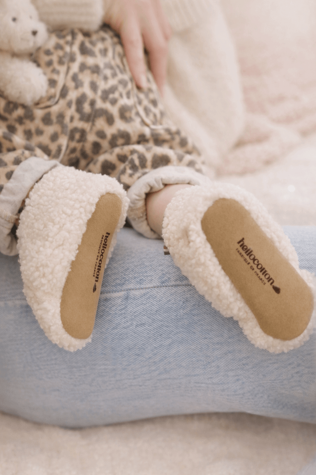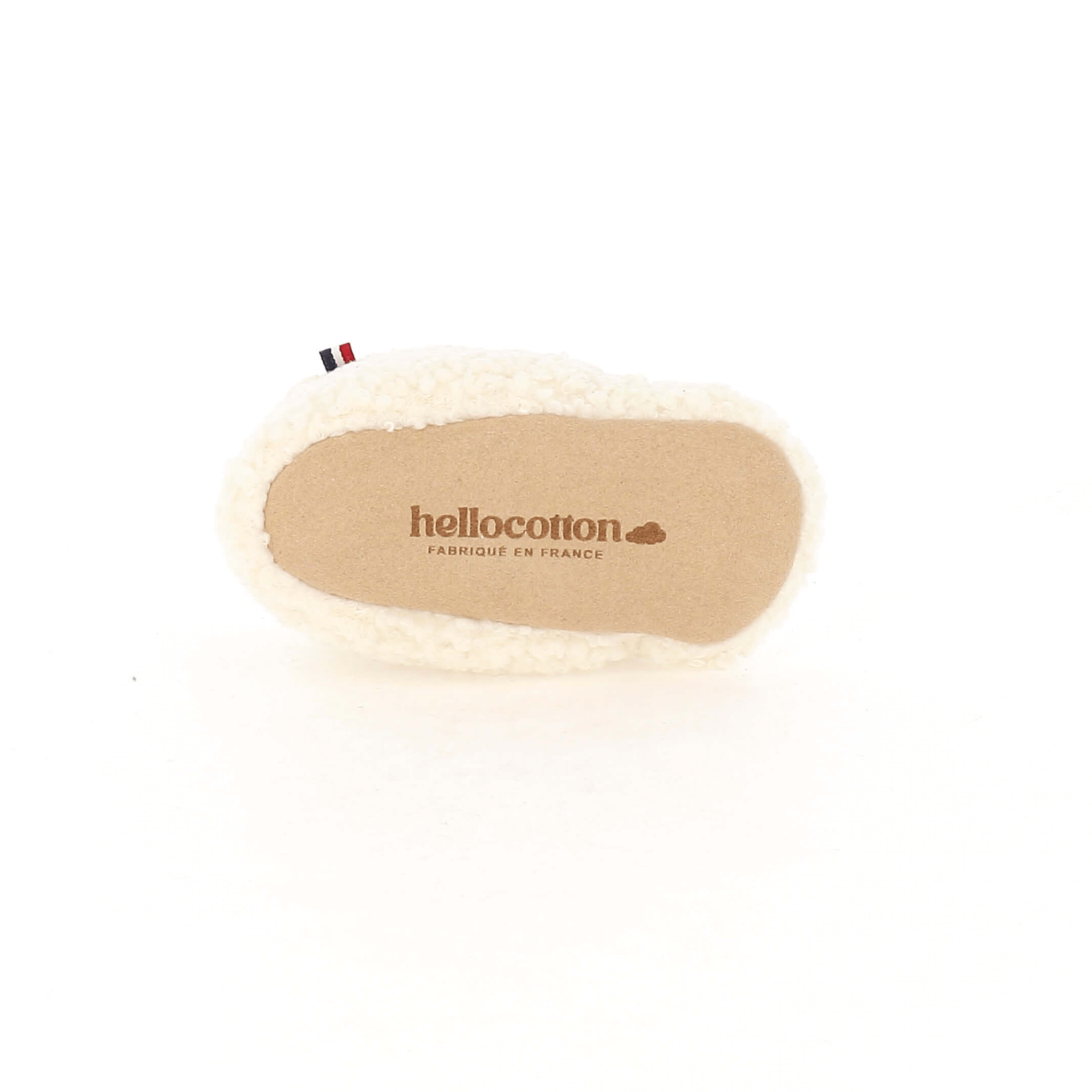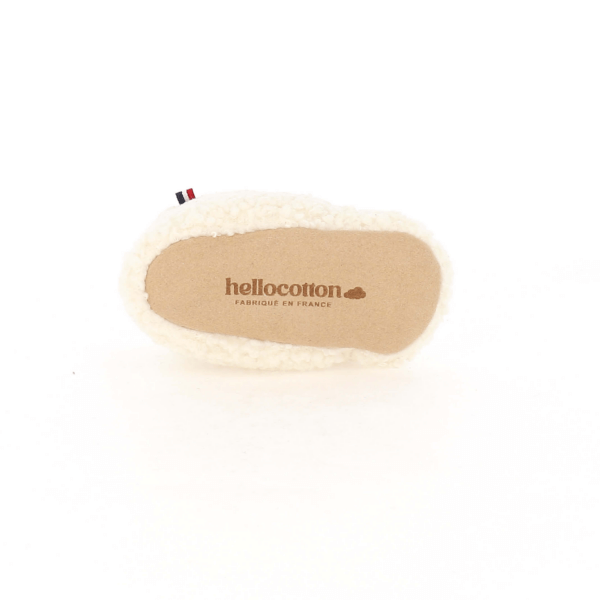 Fabriqué en textile sherpa, effet peau de mouton, avec une doublure douce et respirante, il intègre une broderie nuage Hellocotton pour une touche lumineuse. Son ouverture élargie et ses petits lacets permettent un enfilage facile et un bon maintien du pied.